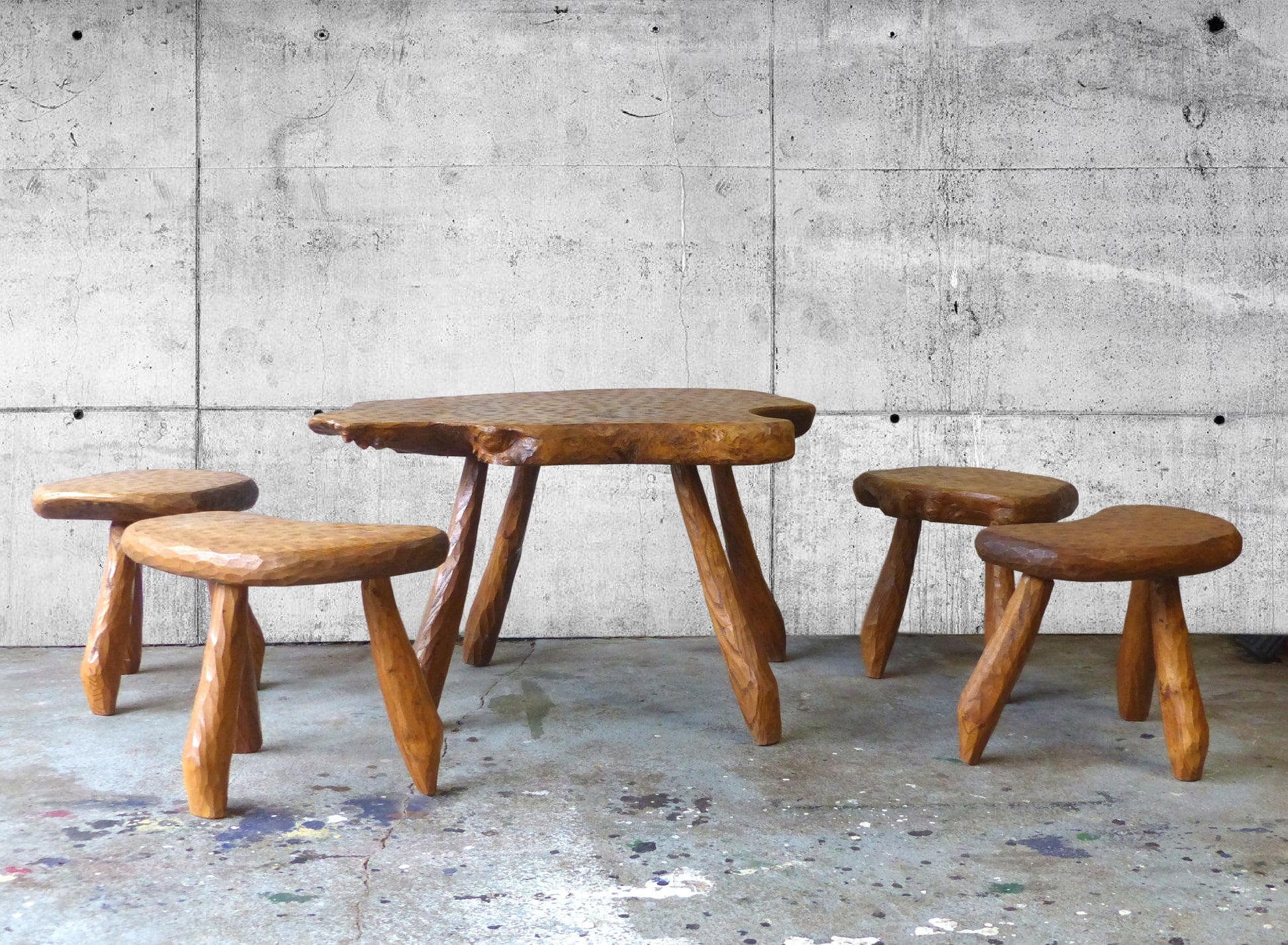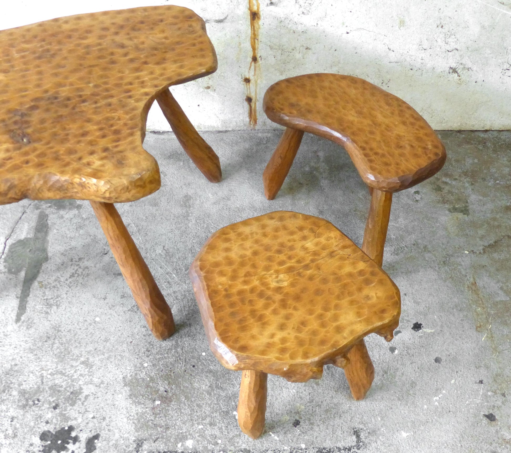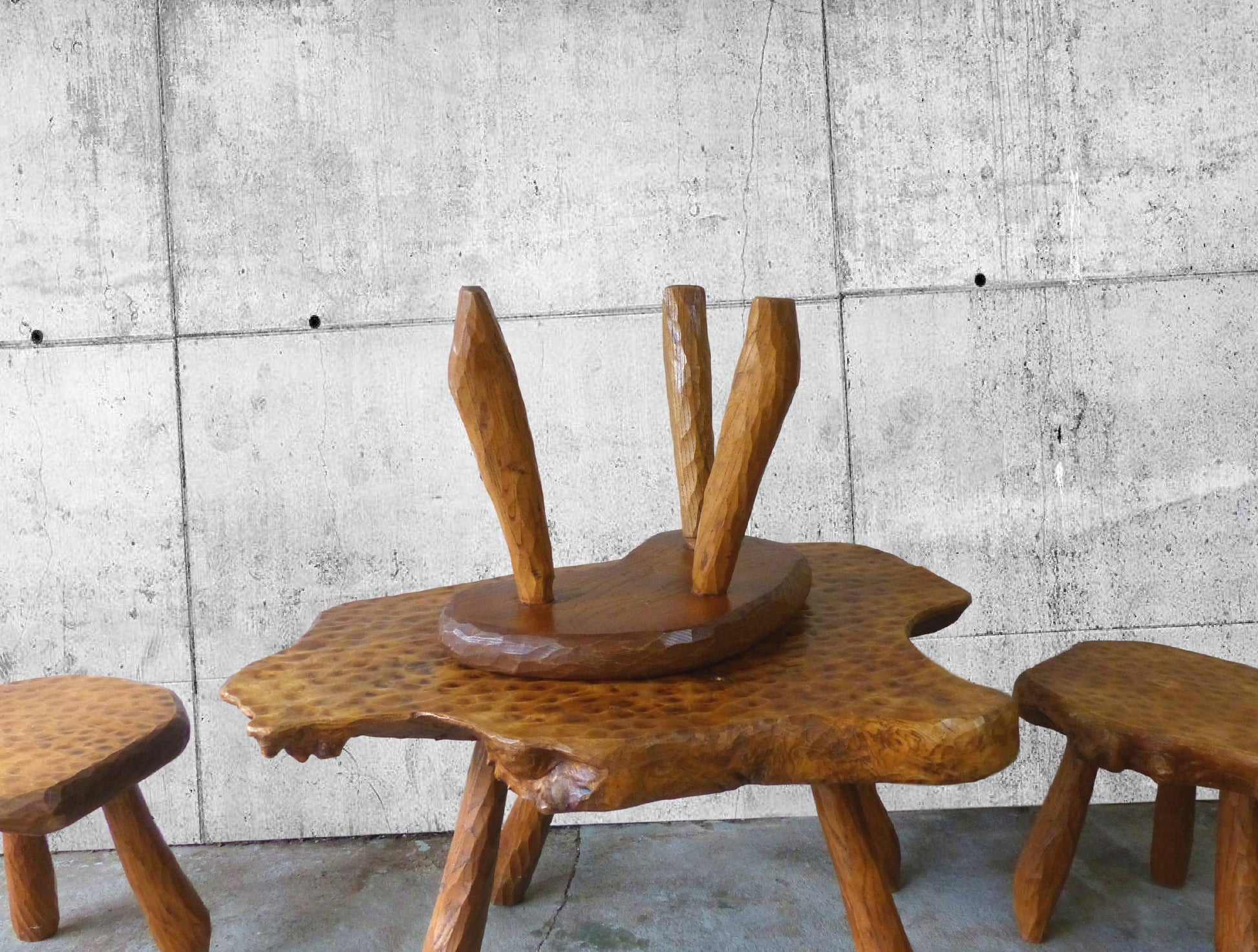 Set of table and 4 brutalist tripod stools inspired by Alexandre Noll.