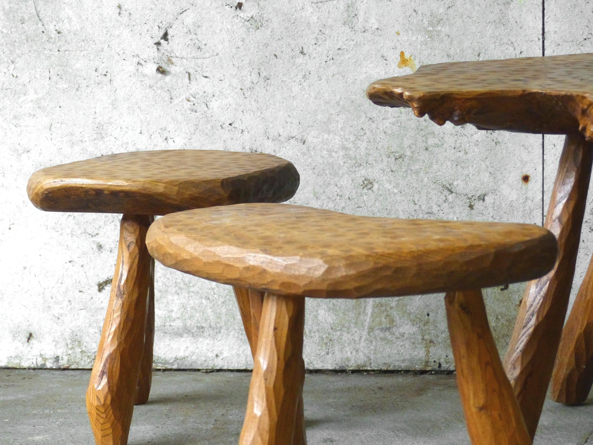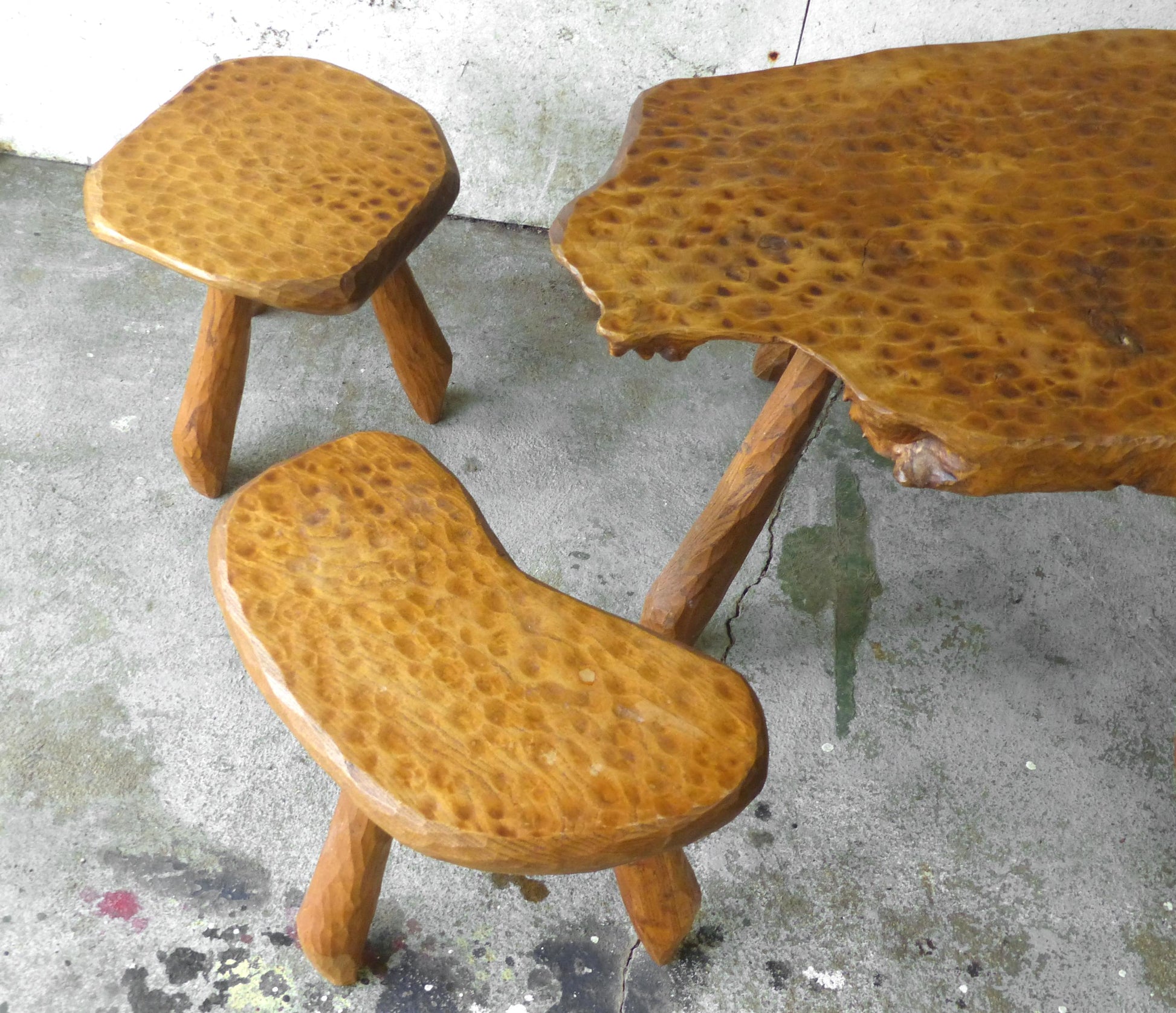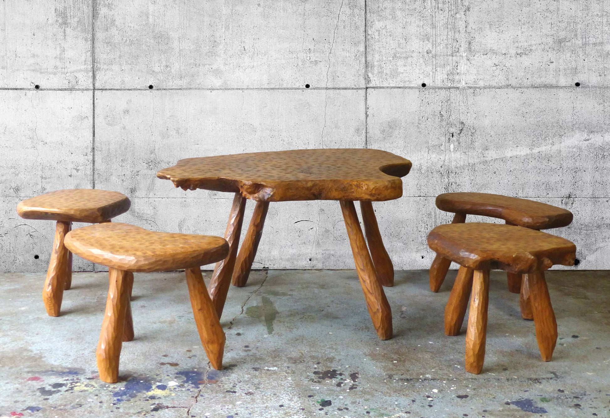 Set of table and 4 brutalist tripod stools inspired by Alexandre Noll.