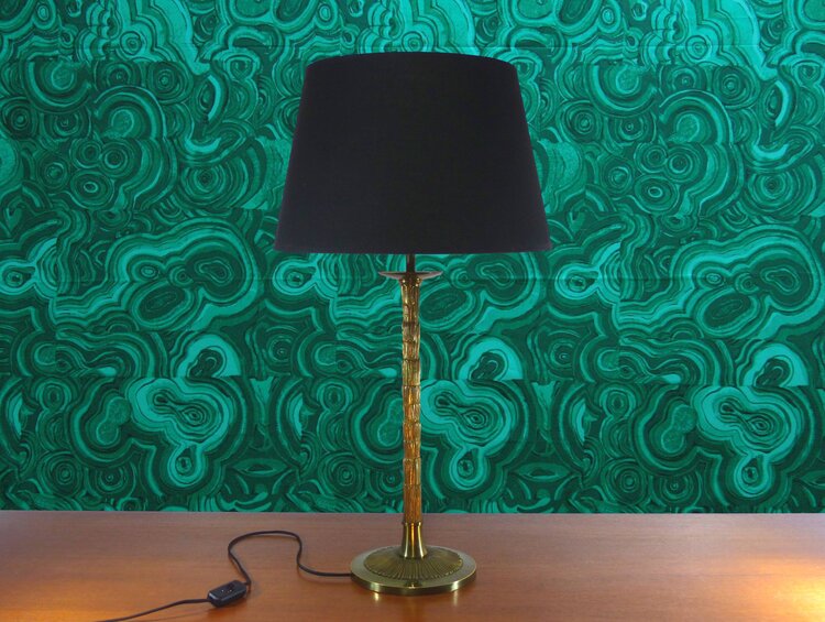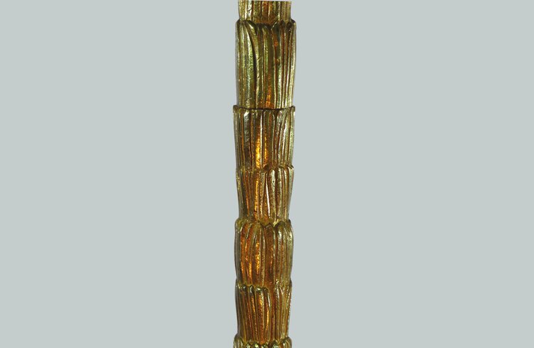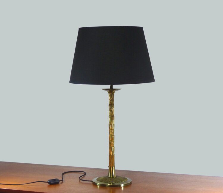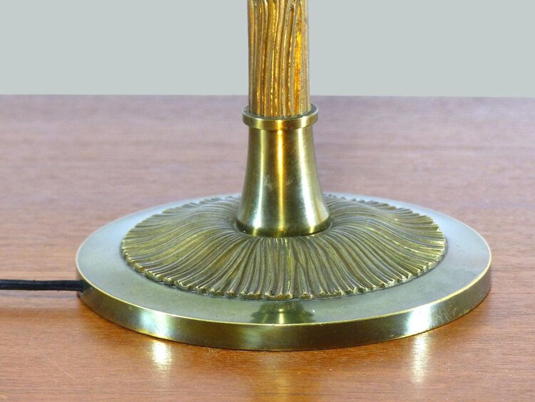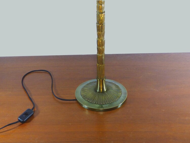 Large table lamp in gilded bronze with a straight cylindrical leafy stem resting on a circular base.