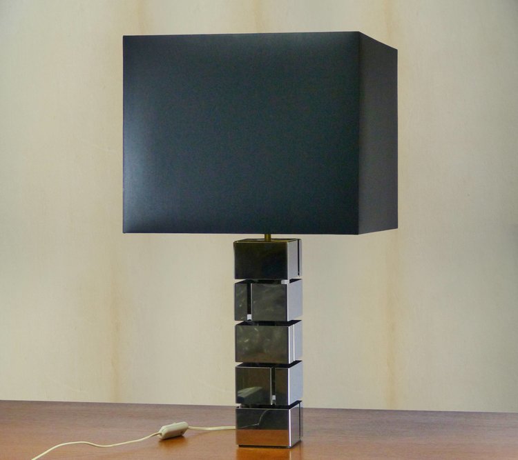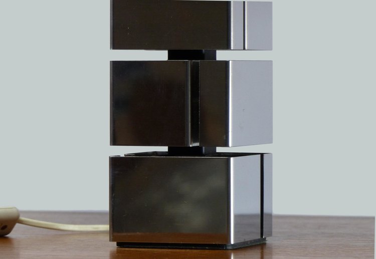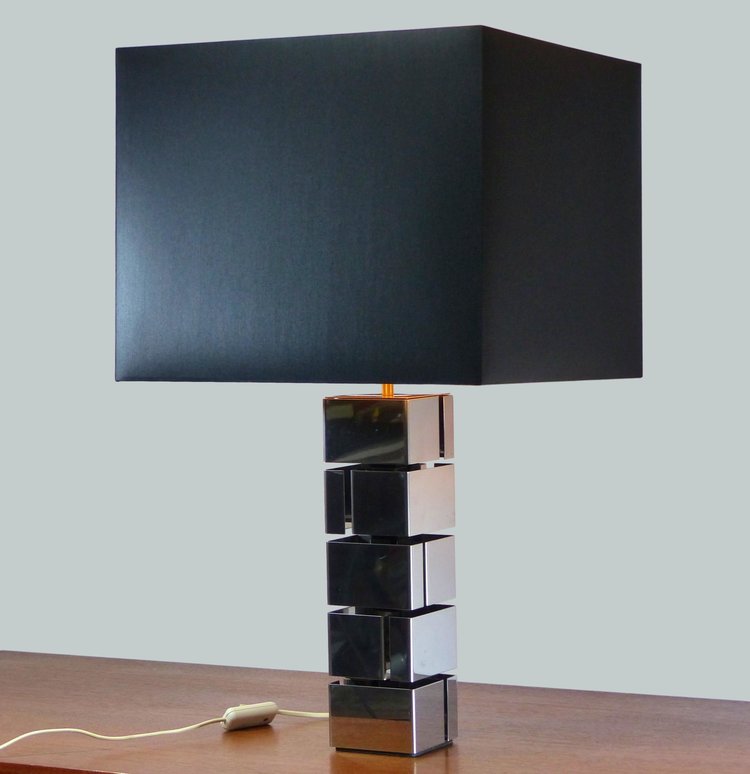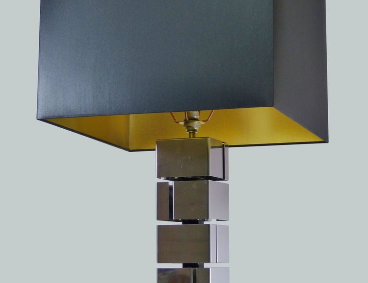 Large sculptural table lamp by the American designer Curtis Jere, made of chromed metal with a square base.