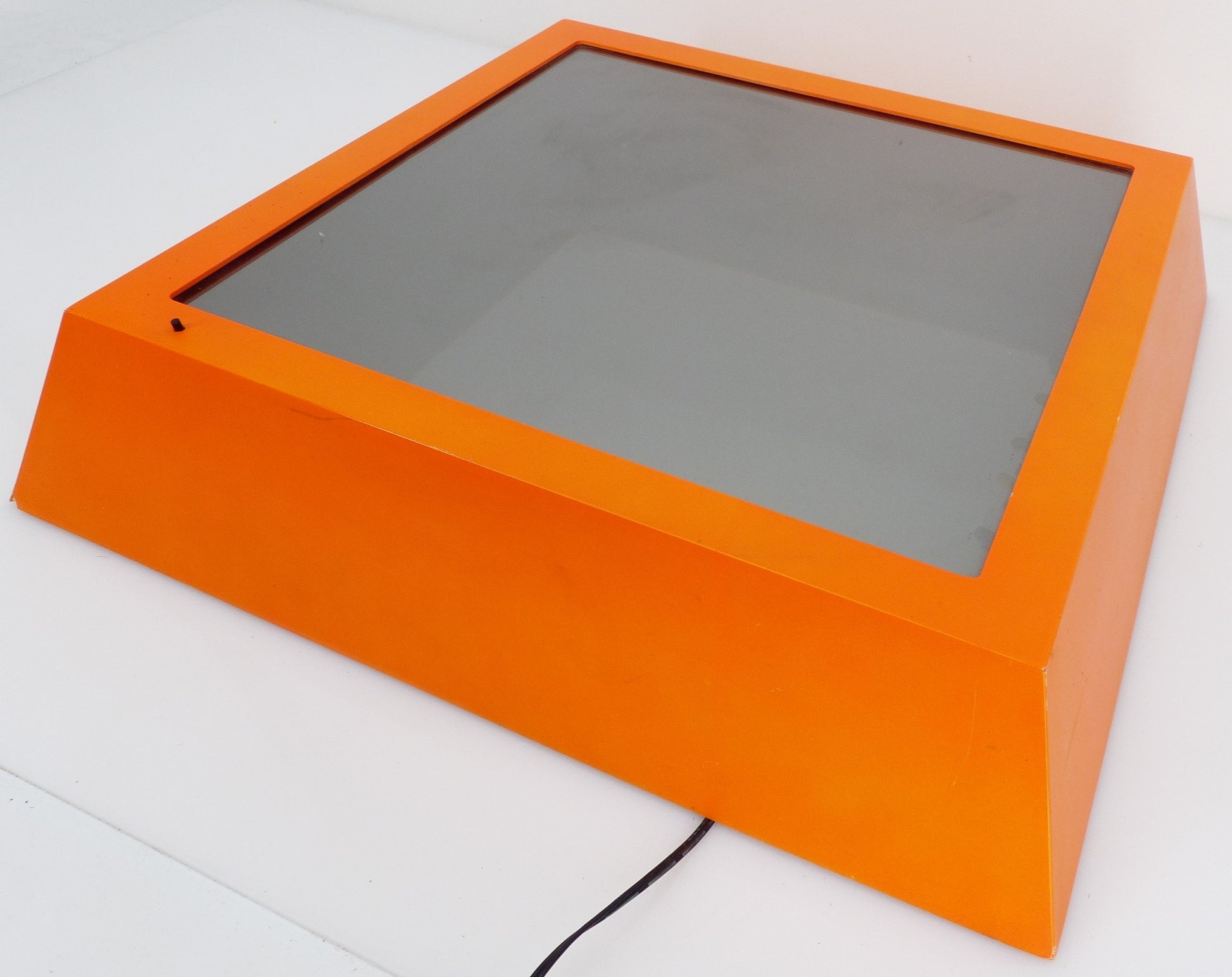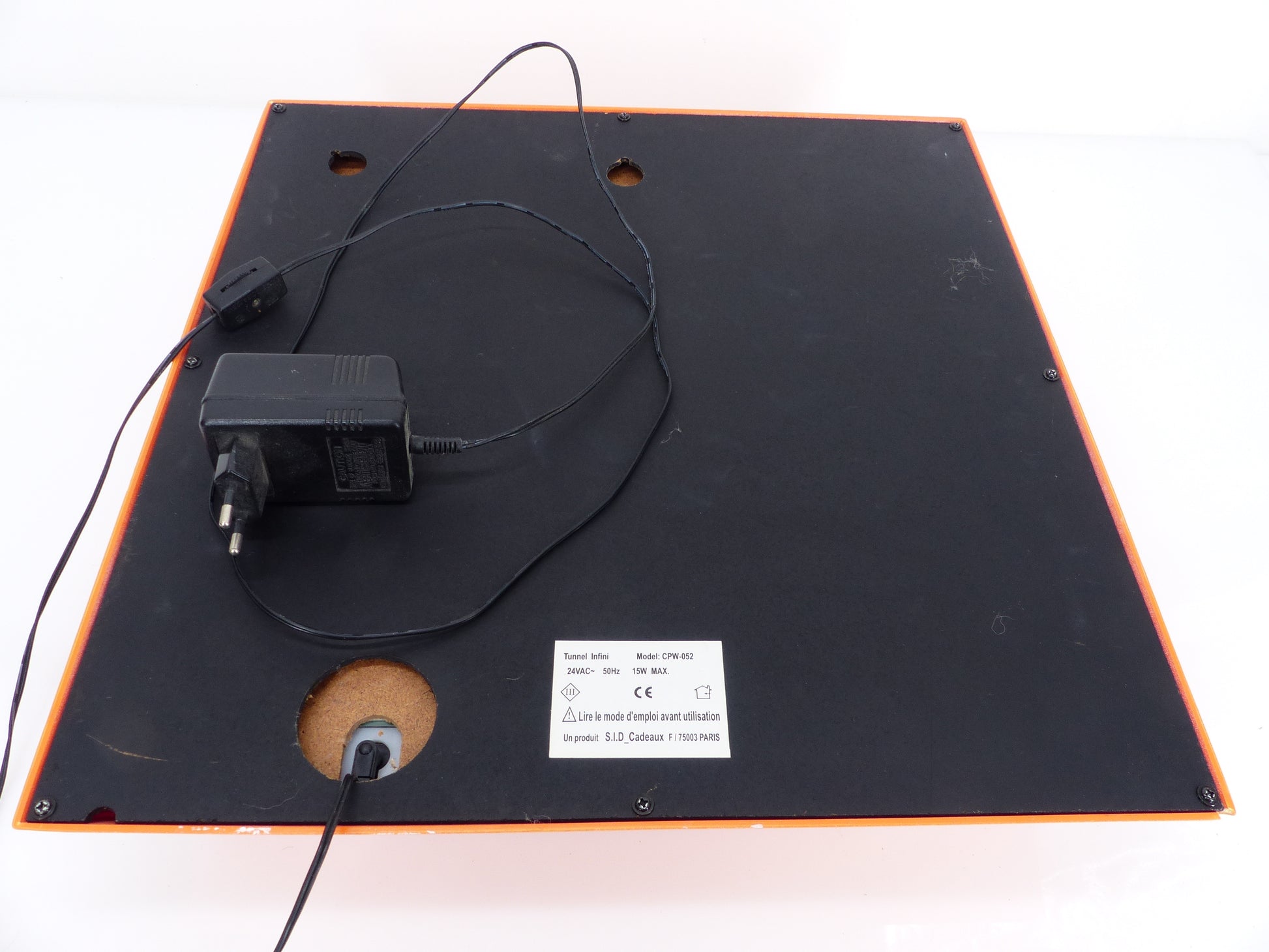 Wall mirror with an infinity tunnel effect, square orange plastic frame, produced in the 1990s. The internal lighting system creates an optical depth effect with multiple points of light and visual animations. A decorative object typical of late 20th-century pop and electronic aesthetics, designed for wall mounting.