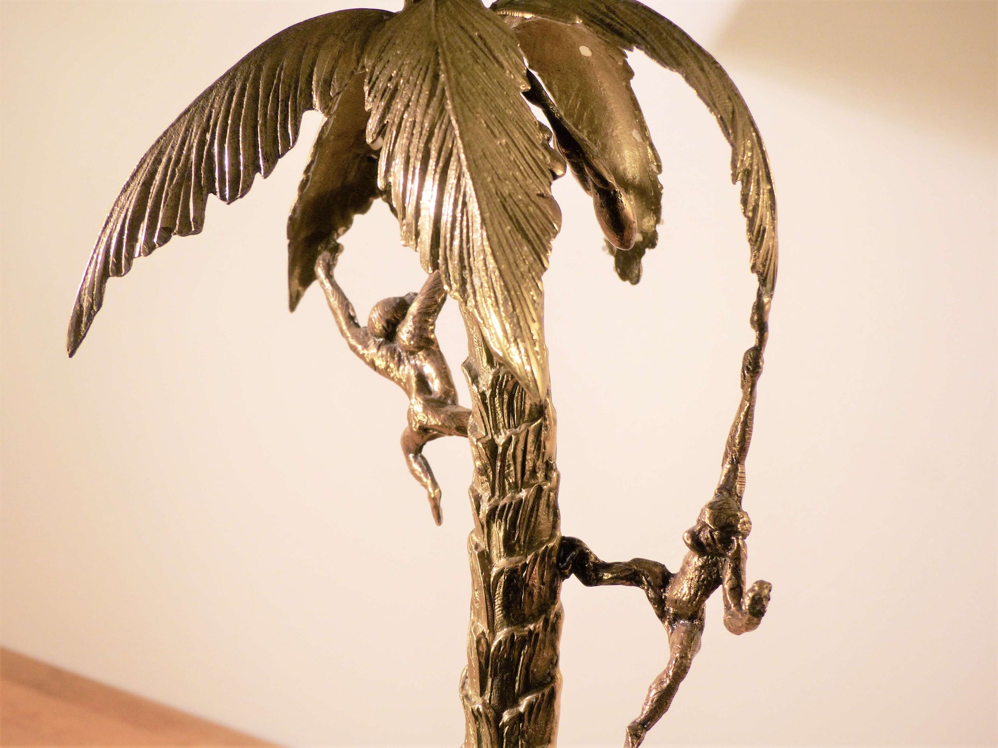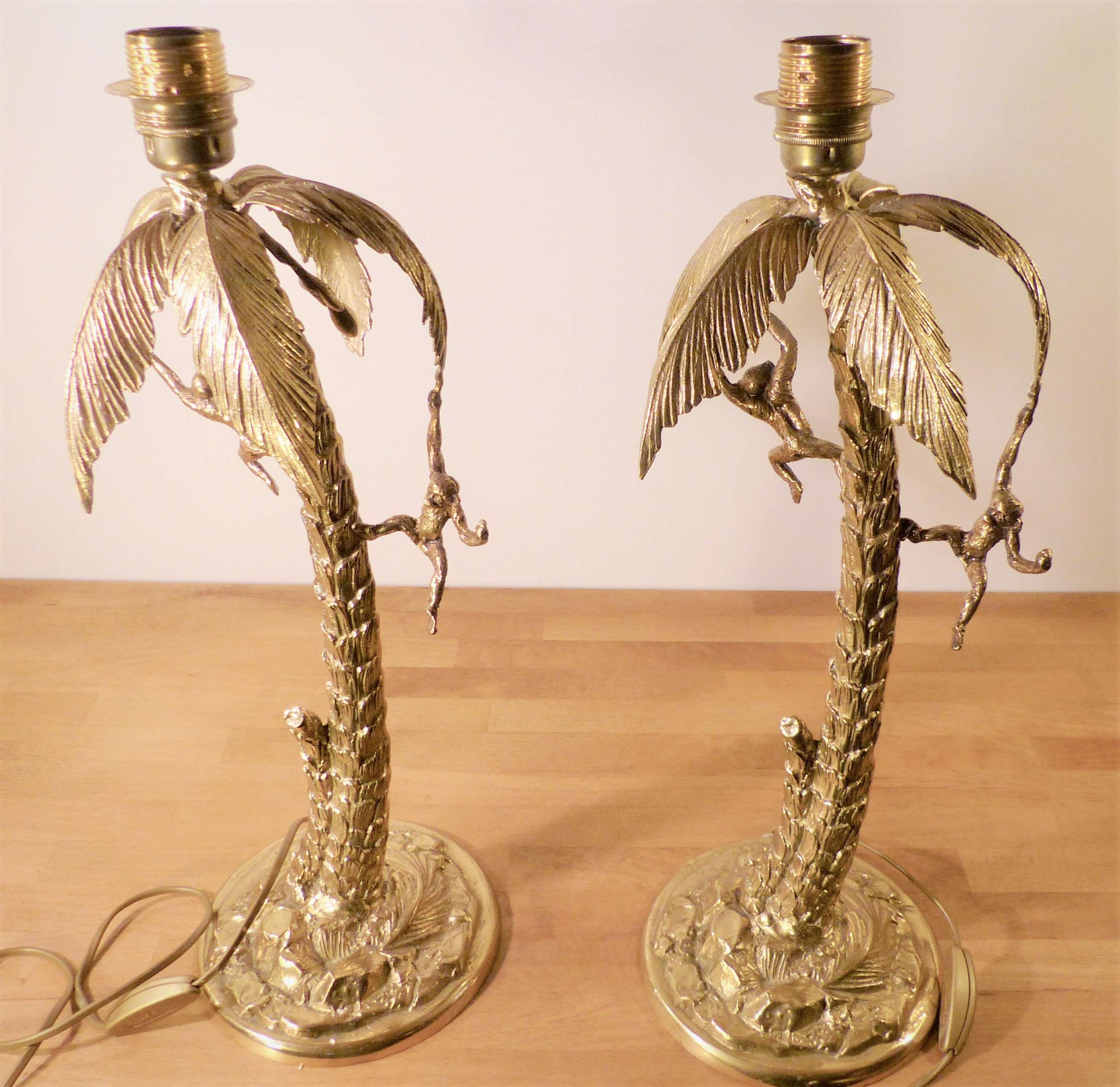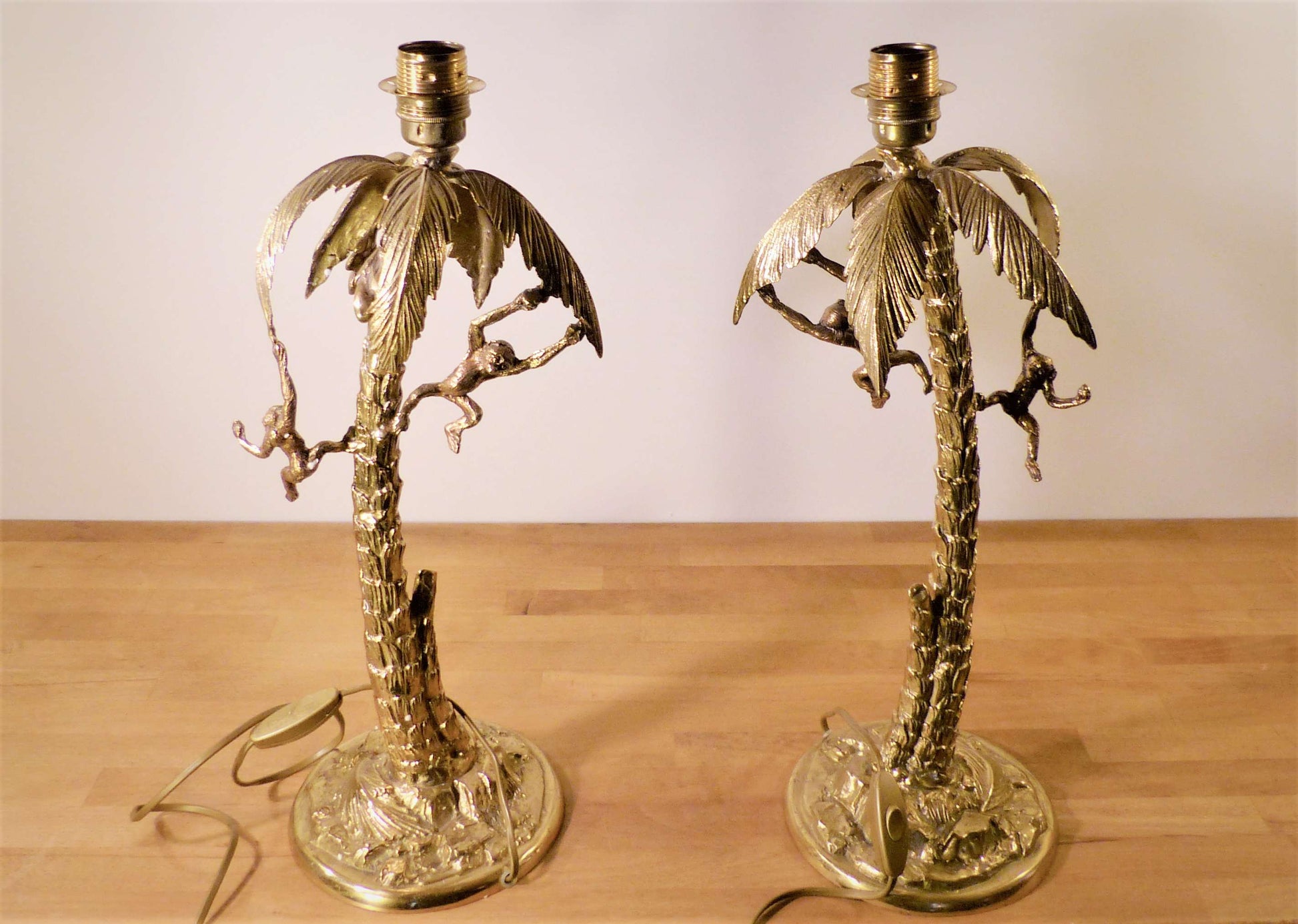 Amusing pair of large table lamps (53 cm overall) in gilded cast iron. Monkeys playing in a palm tree, in pure Hollywood regency style.
