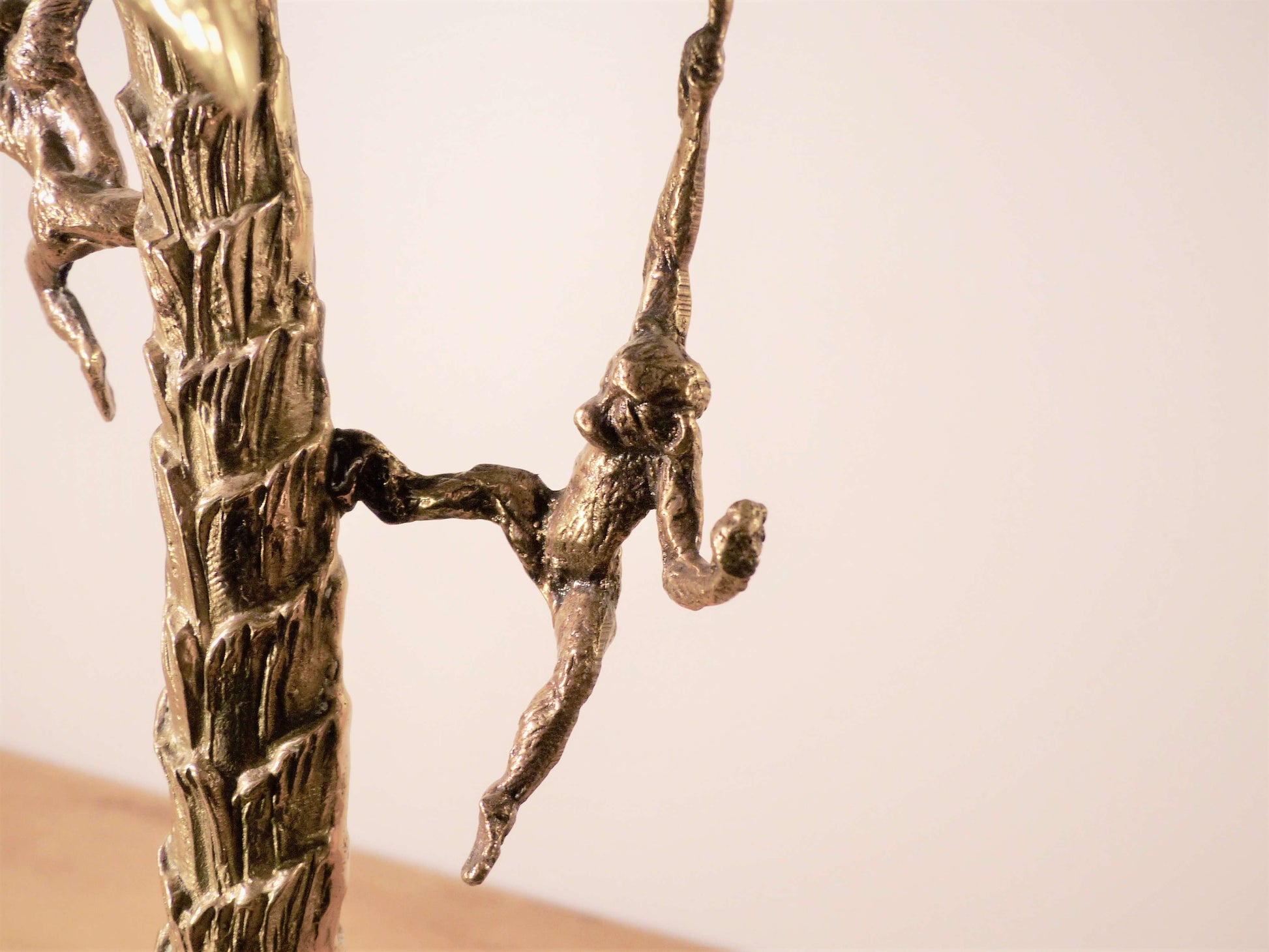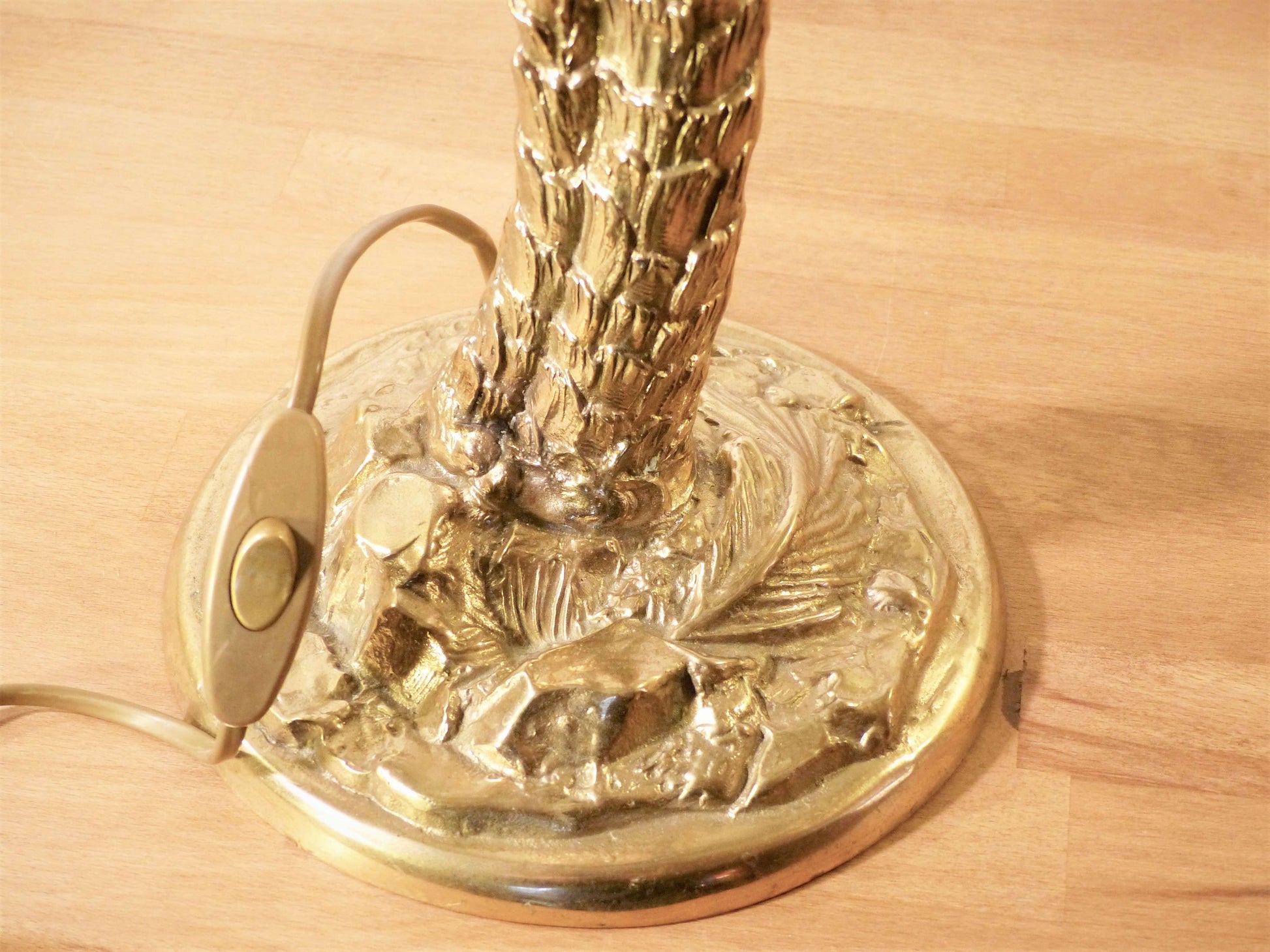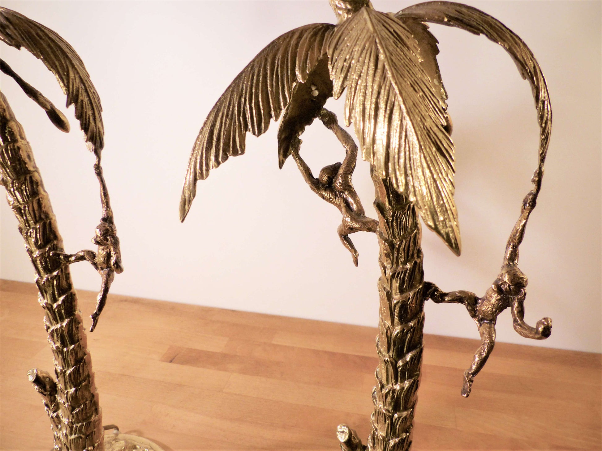 Amusing pair of large table lamps (53 cm overall) in gilded cast iron. Monkeys playing in a palm tree, in pure Hollywood regency style.