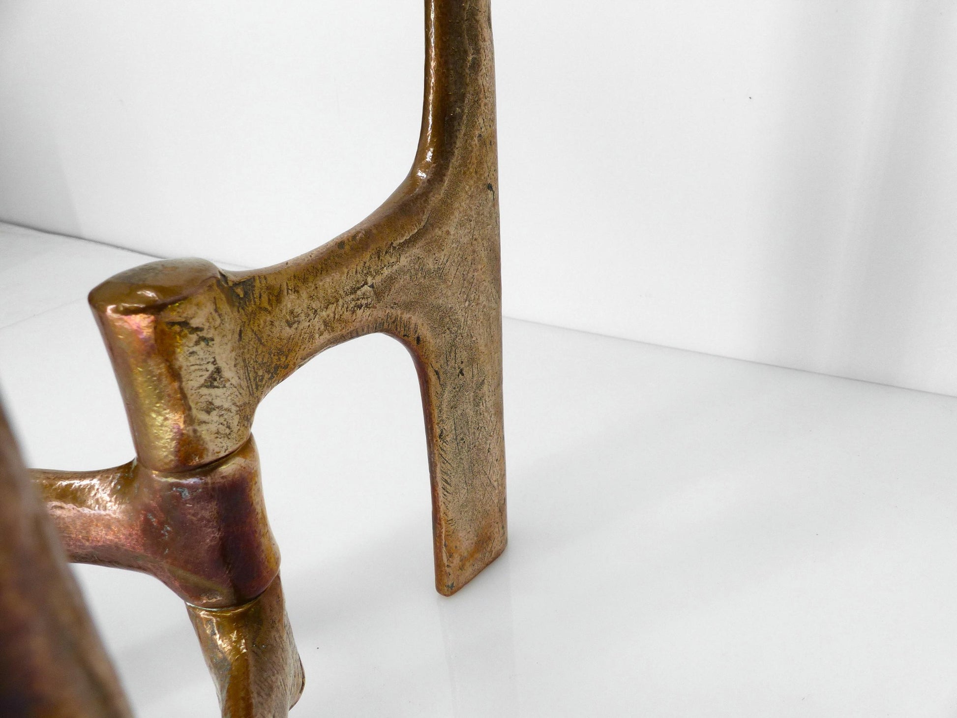Spectaculaire chandelier tripode en bronze à trois bras, design brutaliste Michael Harjes. Cette pièce sculptural mesure une taille exceptionnelle 62 cm de hauteur. Chaque bras est monté sur un axe pivotant autour de la structure centrale, permettant une légère variation de position. La surface présente une belle patine dorée aux reflets cuivrés, protégée par un vernis. Un exemplaire emblématique de l’artisanat allemand moderniste de l’époque.