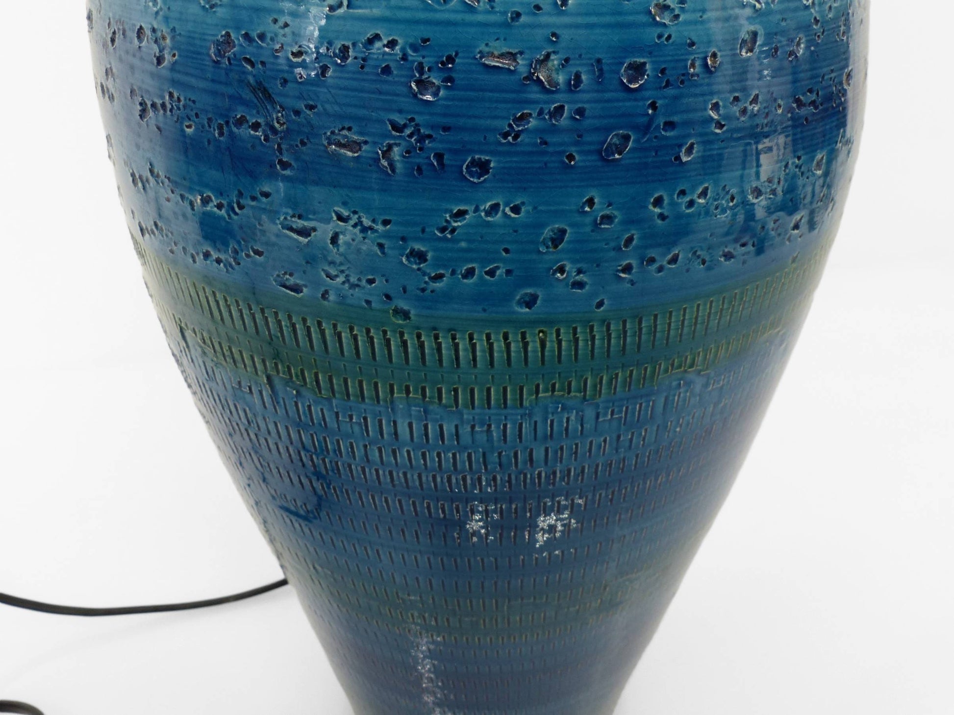 Grande lampe en faïence émaillée bleue et verte, dans le goût des productions italiennes de Bitossi sous la direction d’Aldo Londi. Pièce décorative typique de la fin des années 1970-début 1980, caractérisée par ses motifs géométriques incisés et sa glaçure brillante aux nuances bleues intenses.