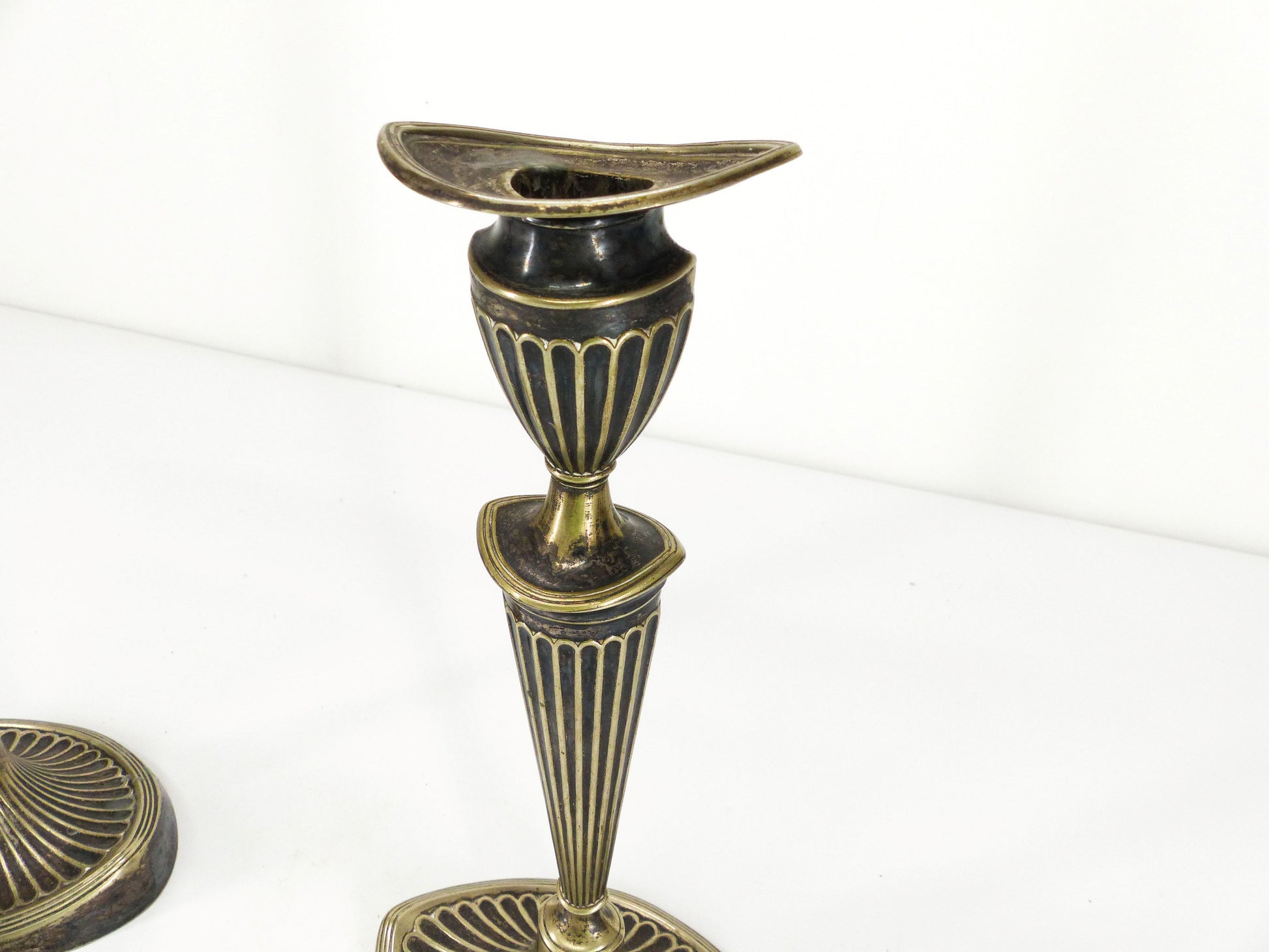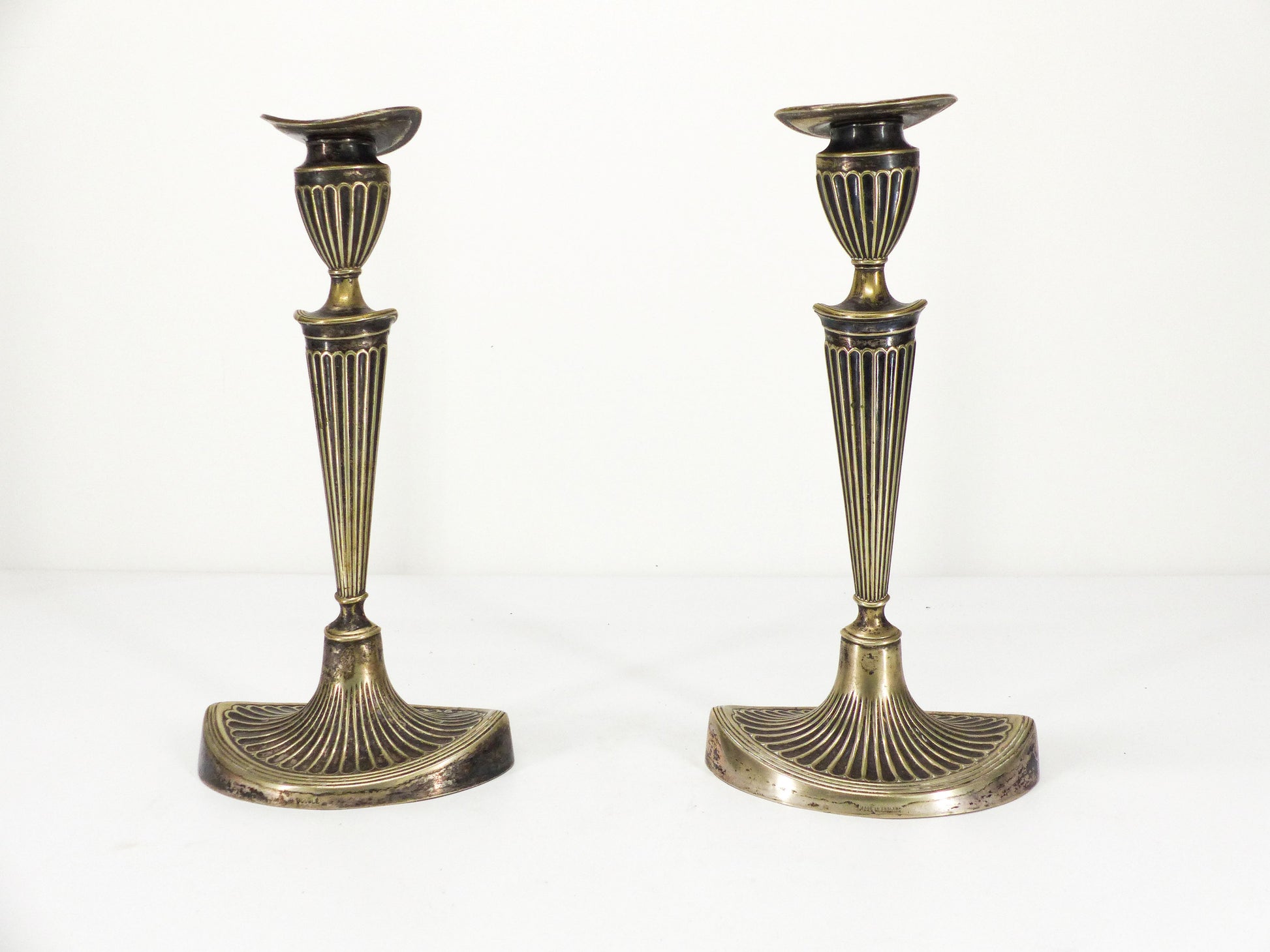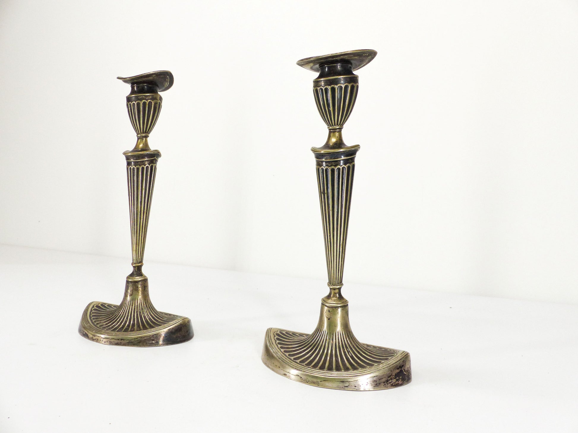 Paire d’élégants bougeoirs anglais Édouardiens en métal argenté, patine d’usage, peut nécessiter un nettoyage.