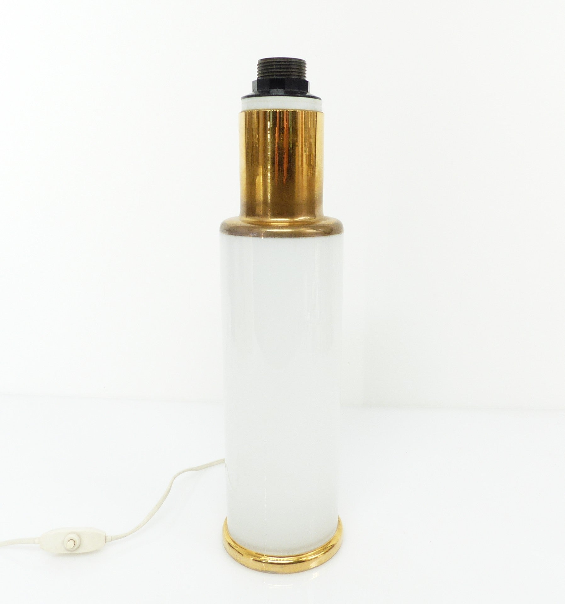 Pied de lampe cylindrique en verre opalin blanc, partiellement recouvert d’un traitement mercurisé doré (effet églomisé) sur la base et le col.