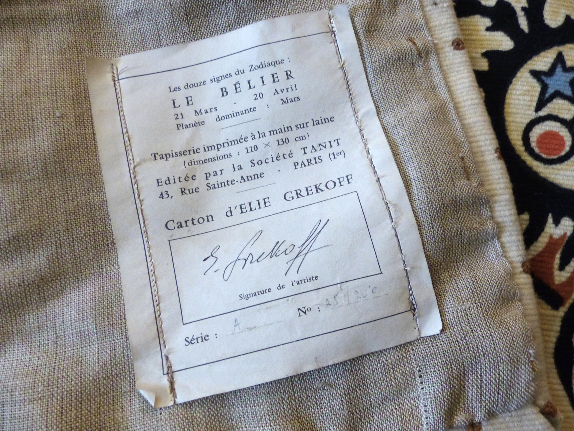 • Bolduc d’origine cousu au revers, portant la signature manuscrite d’Élie Grekoff et la numérotation 25/200